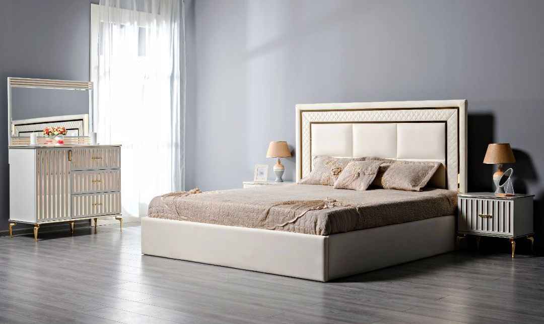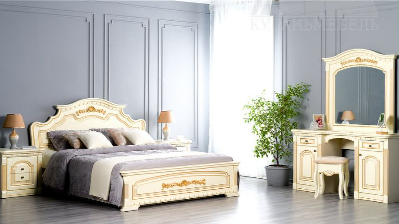 Коллекция мебели для спальни Деметра выполнена из высококачественного МДФ с 3D фрезеровкой, украшена изготовленными вручную декоративными элементами, покрытыми сусальным золотом.
